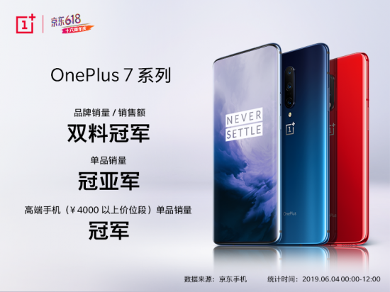 本周二上午10点,一加手机品牌日在京东商城正式启动,拥有90Hz流体屏的旗舰机皇一加7 Pro再次开售,同时全速旗舰一加7开启首销。截至当天中午12点,一加7系列赢得手机通讯排行榜的品牌销量、销售额双料冠军;同时,一加7 Pro与一加7分别摘得京东的单品销量冠、亚军名次,一加7 Pro成为京东4000元以上价位段单品销量冠军。
